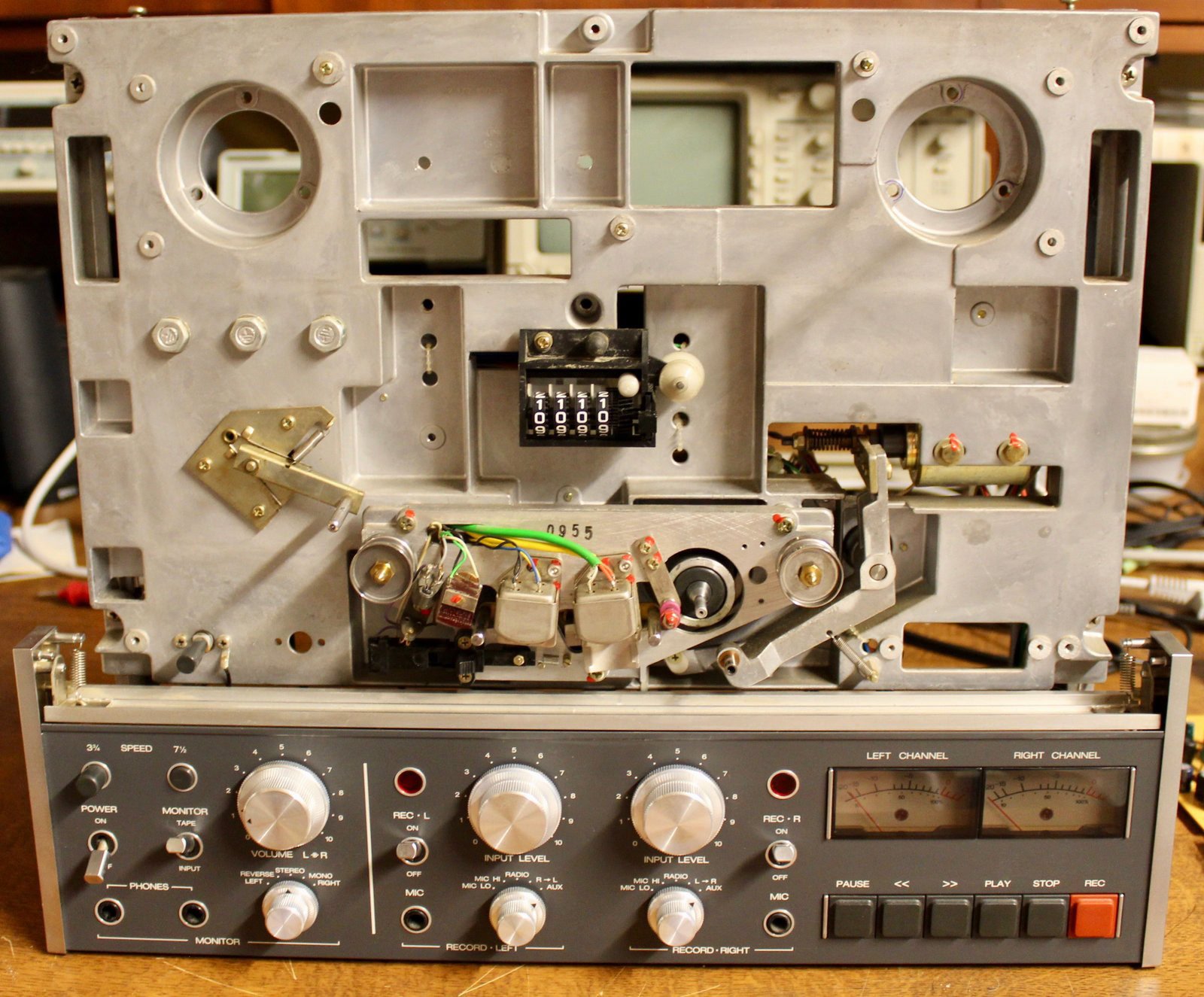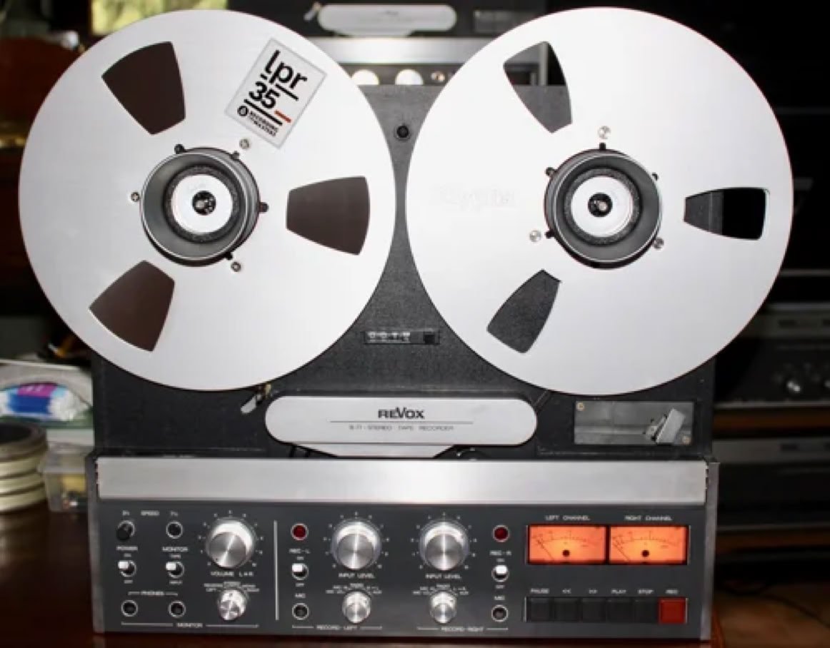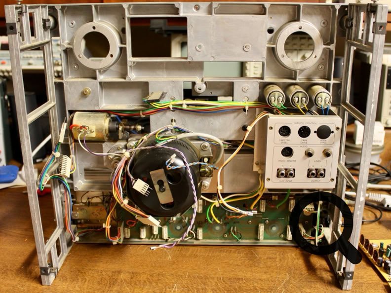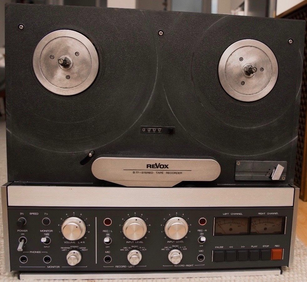 Endlich habe ich eine B77 2-Spur zu einem vernünftigen Preis bekommen. Die Frontplatte ist durch die Spulen stark eingeschliffen, das sieht wirklich nicht gut aus. Die Bremsen und das Bandeinlauflager quietschen, die Andruckrolle löst sich so langsam auf und da sind noch ein paar Baustellen. Zum Glück ist die Maschine ,unverbastelt‘.