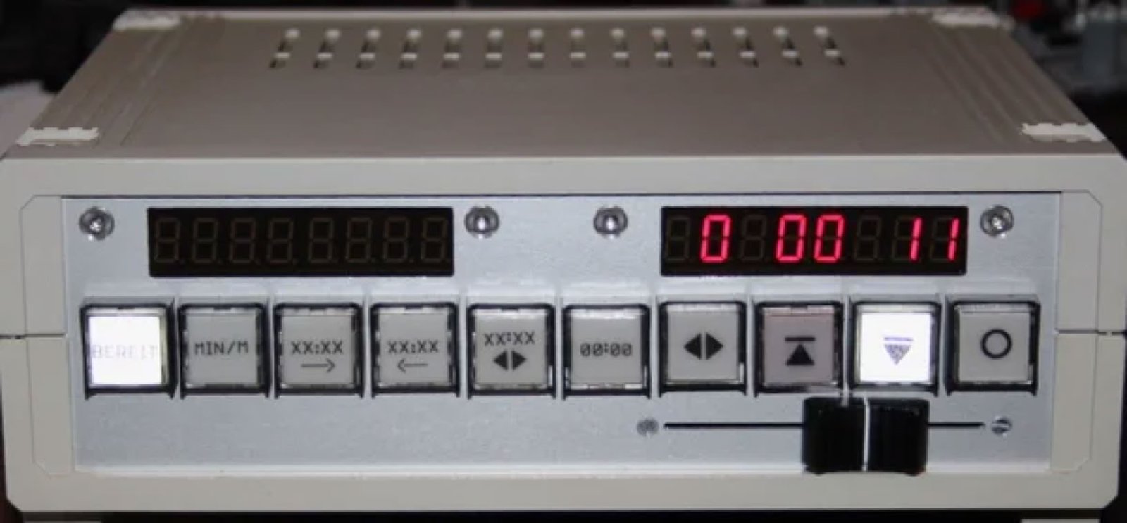Links soll dann der gespeicherte Zählerstand, die Bereitschaftsanzeige, Umschaltung für min/sec und m/cm, lesen des gespeicherten Zählerstands, speichern des aktuellen Zählerstands und Spulen zur gespeicherten Position dargestellt werden.