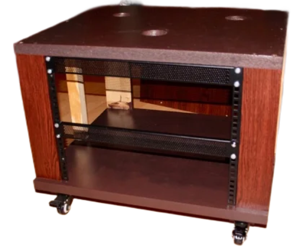Kernstück ist ein selbstgebautes, stabiles 19 Zoll Rack mit 8HE auf Schwerlastrollen.