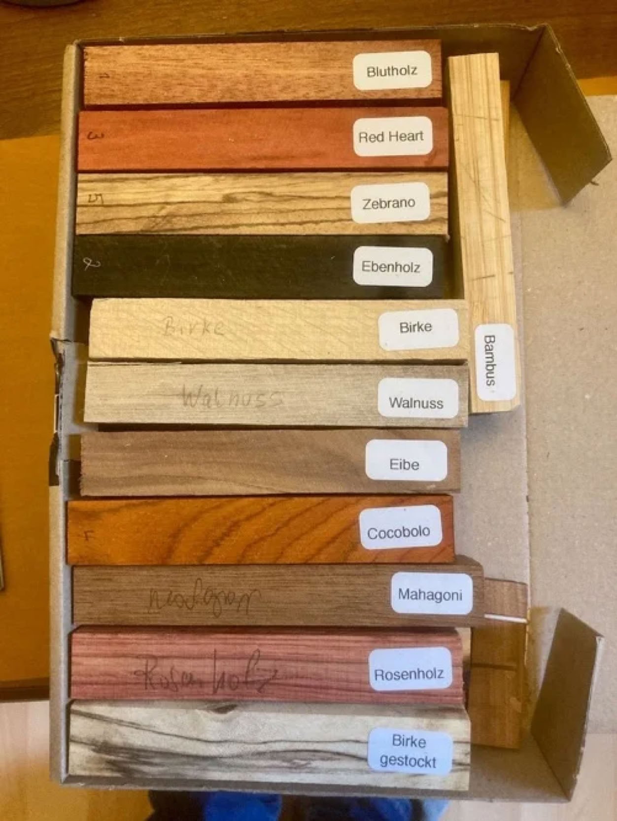 Es können alle heimischen Harthölzer verwendet werden oder man besorgt sich exotische Hölzer. Ich nutze Beides.