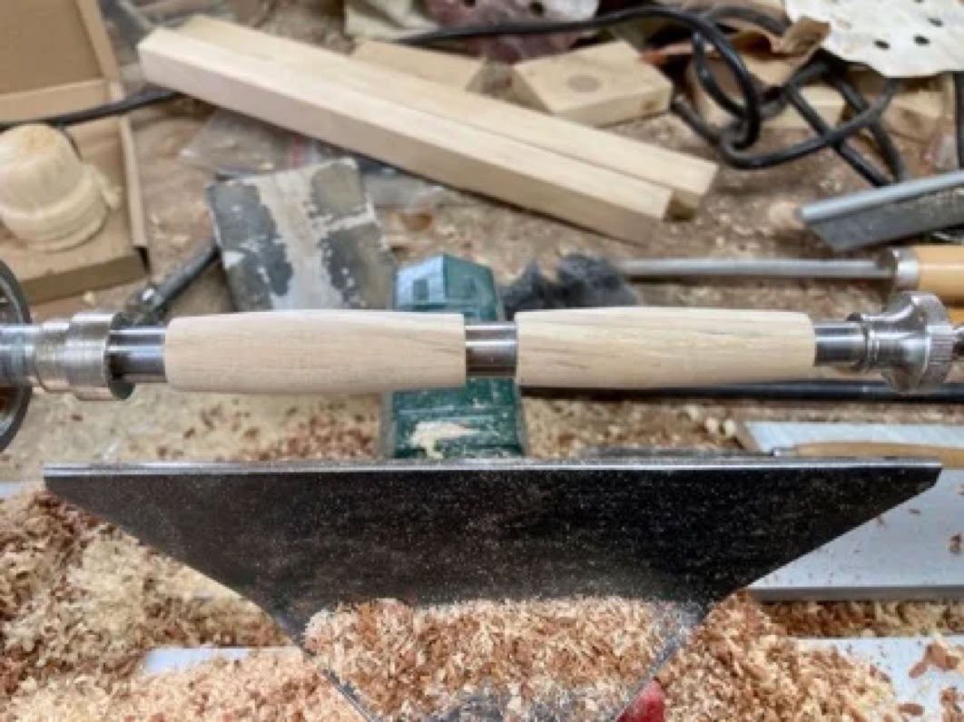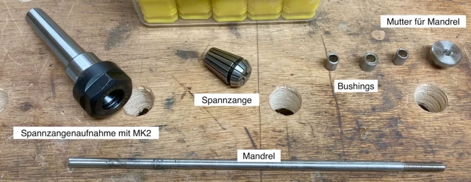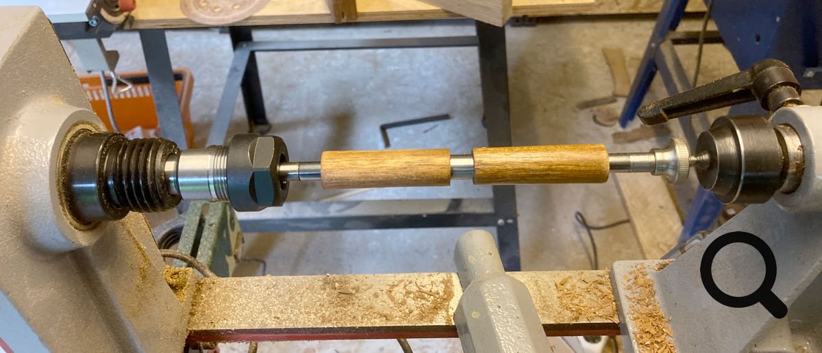 Hier ein kleines Hilfsmittel, zum Bohren der Löcher für die Hülsen.Wenn man drechseln will, benötigt man eine Drechselbank, das ist klar, aber für das Stiftedrechseln, noch ein paar Sachen mehr. Die Rohlinge werden auf einem sogenannten Mandrel befestigt, dieser kann entweder mit einer Spannzange gehalten werden oder er besitzt direkt eine MK2 Aufnahme (MK1 gibt es auch).