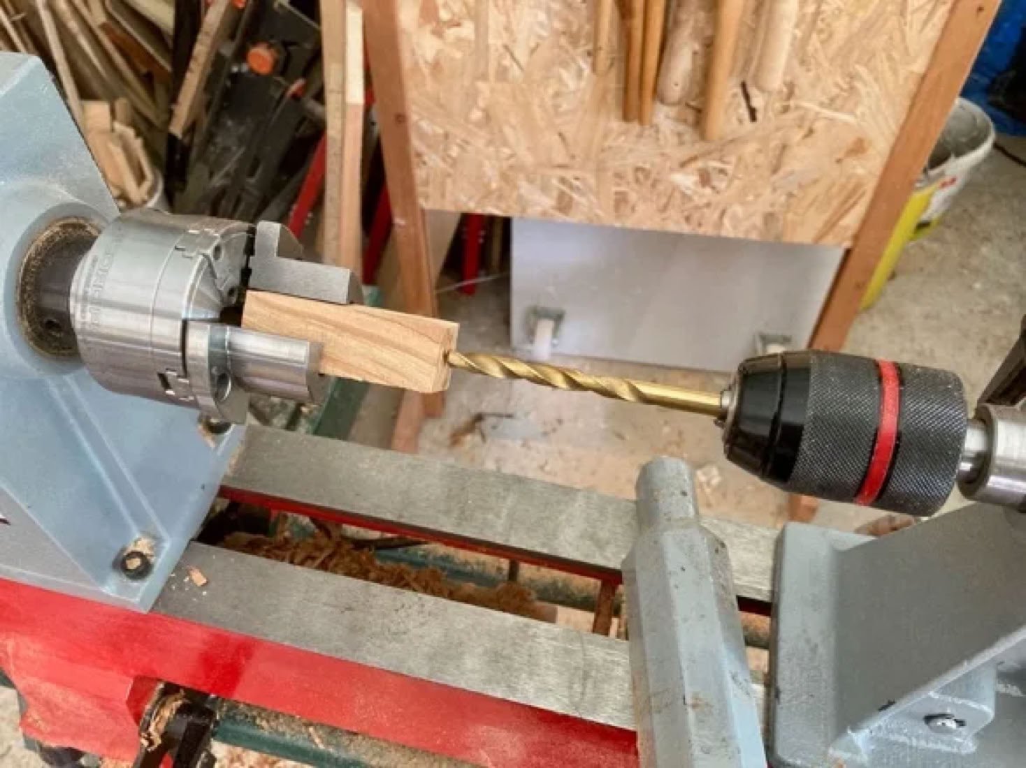 Ein Drechselfutter mit Spannbacken für Kulis vereinfacht das Bohren für die Hülsen erheblich.