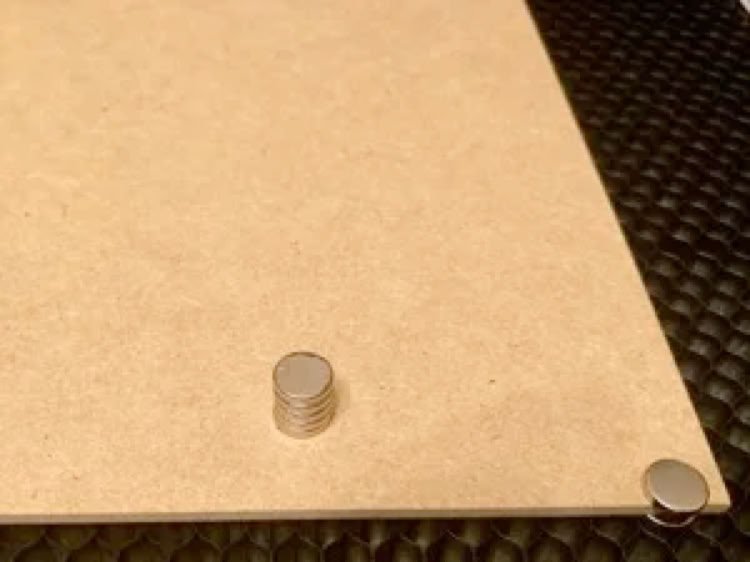 Wenn man Teile nicht nur gravieren, sondern auch schneiden will, ist ein Wabengitter unverzichtbar. Es sollte darauf geachtet werden, dass die Waben aus Eisenmetall sind, somit kann man Teile mithilfe von Neodym-Magneten fest positionieren, auch können sie als Abstandshalter verwendet werden, um Branntspuren auf der Rückseite zu verhindern. Waben aus Aluminium sind preiswerter, haben aber den Nachteil, das sich Teile nur mit Clips aus Acryl oder Holz einspannen lassen. Das hält nicht besonders und ein wiederholgenaues Arbeiten ist auch nicht möglich.