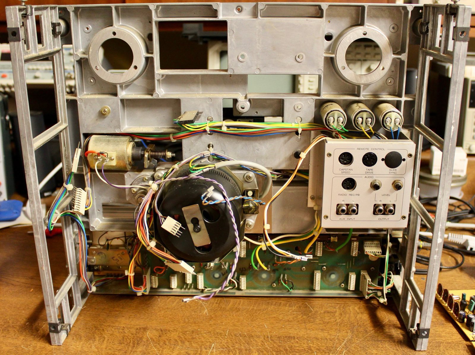 Die Motorkondensatoren, die Kondensatoren im Netzteil und der Störschutzkondensator in der Netzzuleitung sind gewechselt. Nun können die Motoren wieder eingebaut und der Zählwerksriemen erneuert werden, gefolgt von der Bremseinheit und dem gesäuberten Bremsmagneten. Jetzt werden alle Elkos, Tantals und Einstellregler auf den einzelnen Leiterplatten gewechselt.