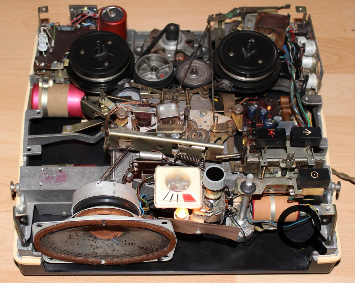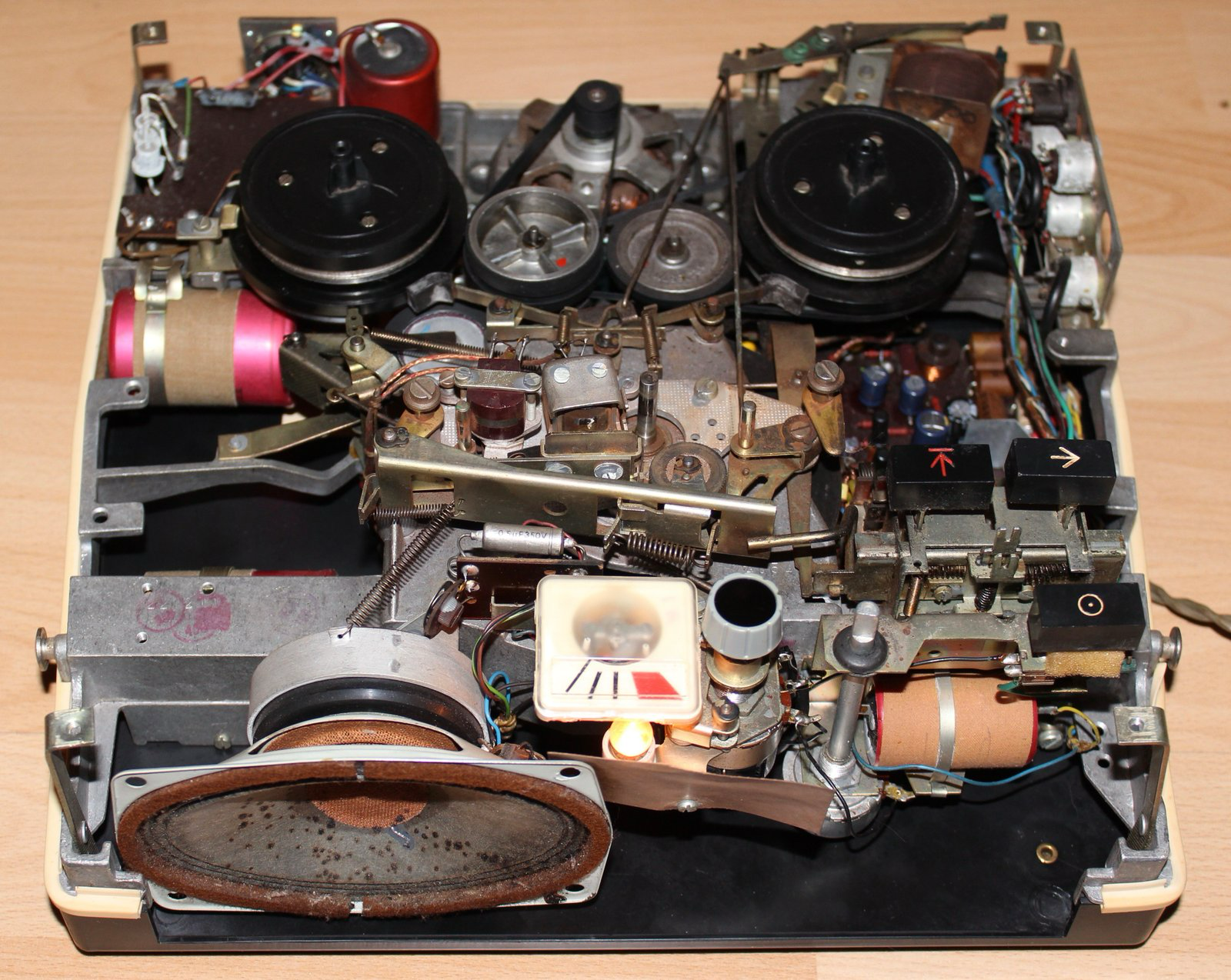Eines meiner ersten Tonbandgeräte war ein B 100 und meine Freude groß, als ich es auf dem Dachboden wiederfand. Die Freude währte allerdings nicht lange, da das Gerät zwar Geräusche, aber keinen brauchbaren Ton von sich gab. Ich habe es dann erst einmal wieder in die Ecke gestellt und mich mit anderen Tonbandgeräten beschäftigt. Neulich fiel mir ein B 100 für sehr kleines Geld in die Hände und so wollte ich eins meiner ersten Tonbandgeräte wieder gangbar machen. Äußerlich sah das B100 ganz gut aus, die Plexiglashaube ohne Brüche und Risse, der Rest etwas eingestaubt. Aber nach dem die Frontplatte abgenommen wurde zeigte sich das ganze Elend, diese Maschiene hat wohl etwas zu feuch gestanden.