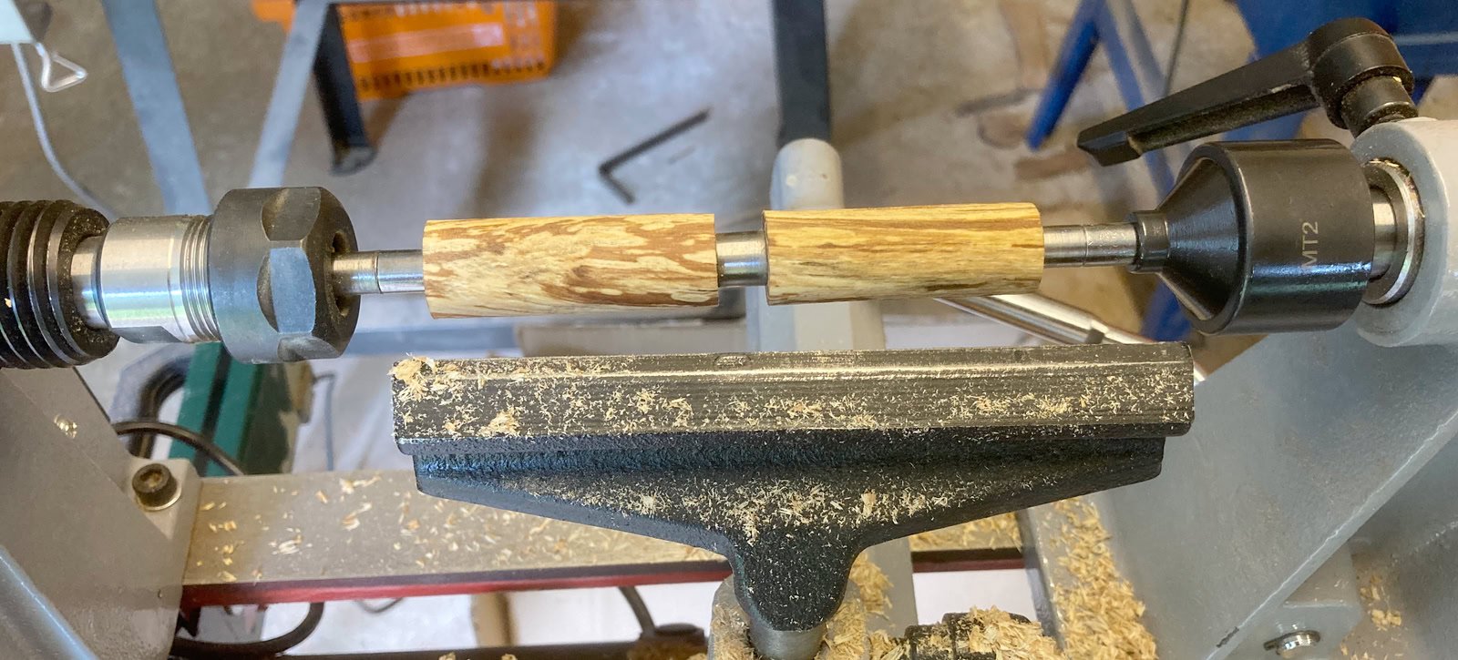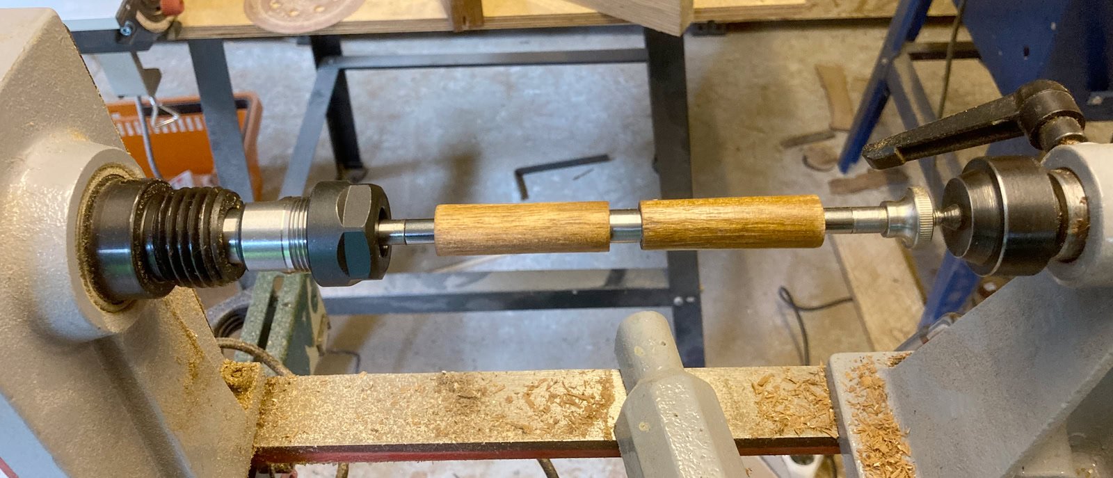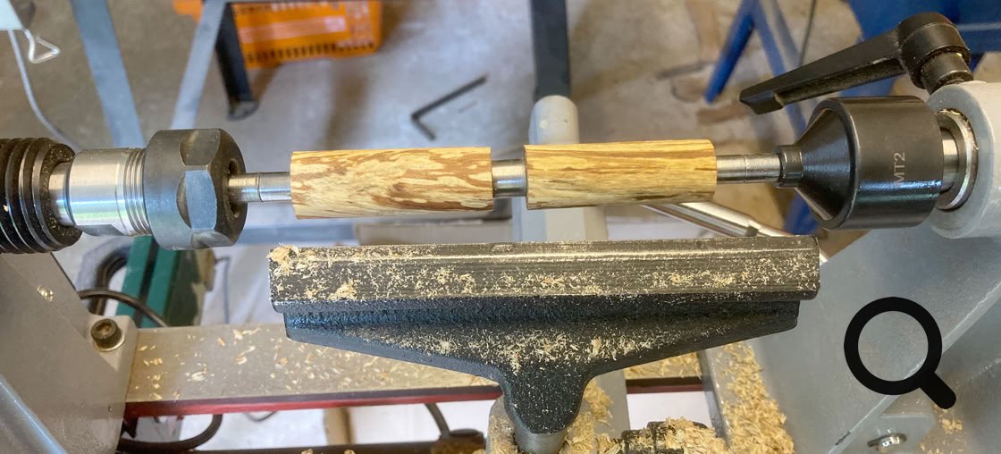 Hier ein kleines Hilfsmittel, zum Bohren der Löcher für die Hülsen.Wenn man drechseln will, benötigt man eine Drechselbank, das ist klar, aber für das Stiftedrechseln, noch ein paar Sachen mehr. Die Rohlinge werden auf einem sogenannten Mandrel befestigt, dieser kann entweder mit einer Spannzange gehalten werden oder er besitzt direkt eine MK2 Aufnahme (MK1 gibt es auch).