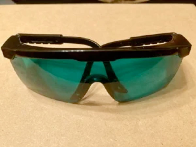 Eine vernünftige Schutzbrille ist eigentlich kein Zubehör, sondern das a und o beim Lasern. Die mitgelieferten Schutzbrillen (links) verdienen ihren Namen eigentlich nicht, da sie kaum schützen, es muss schon eine zertifizierte Schutzbrille sein!